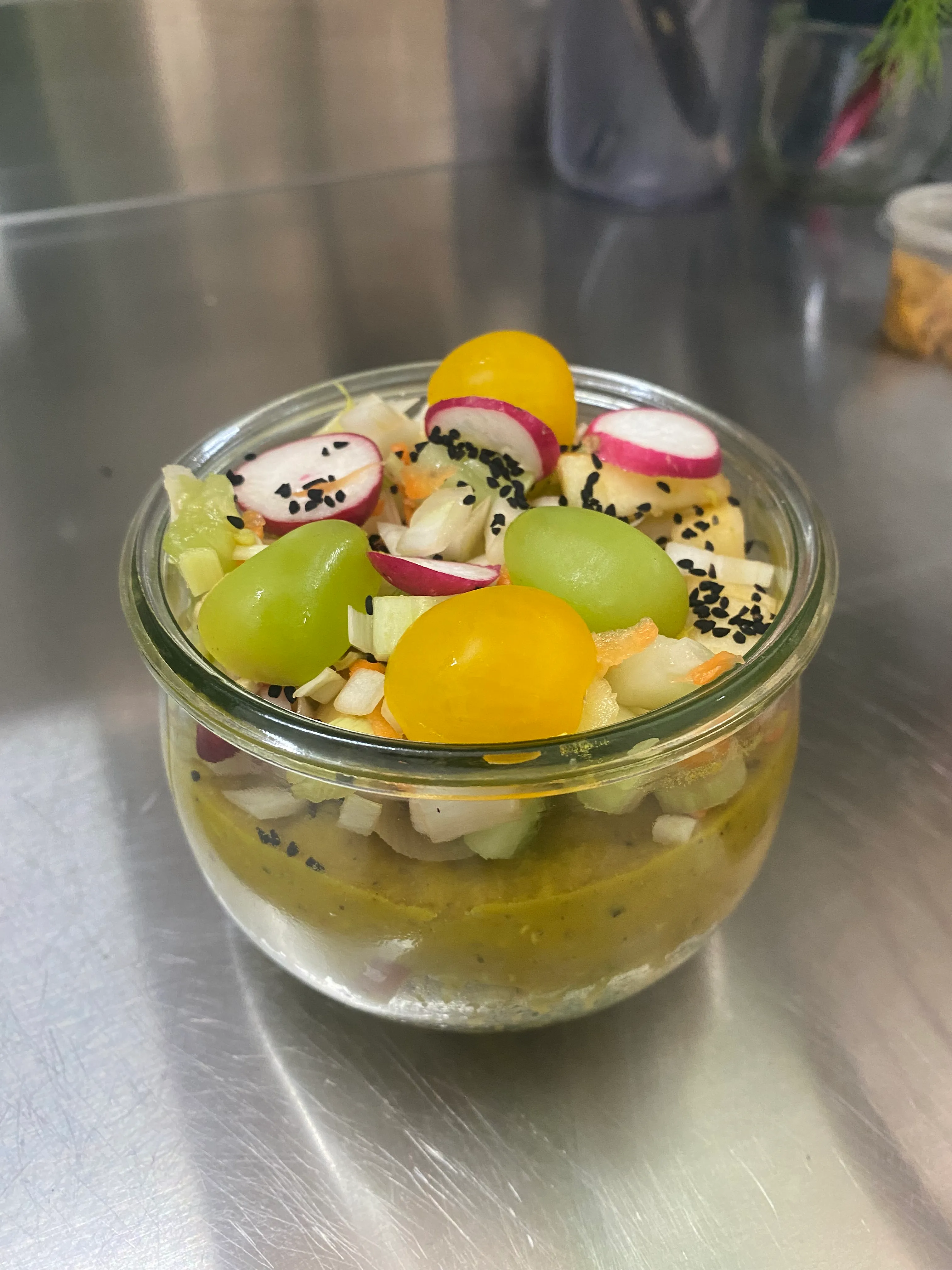 Il comprend : Une base de crudités + Une base de légumes cuits + Une source de protéines animales ou végétales